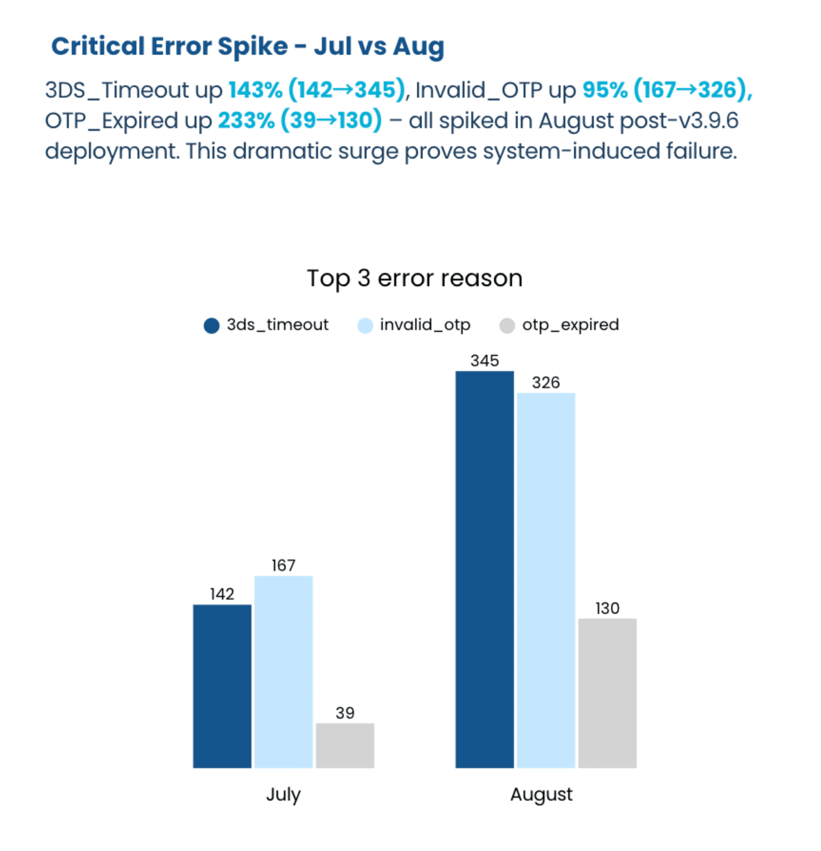 Multi-layered analysis identified v3.9.6 release series as primary driver. Pareto analysis revealed 40% failures concentrated in 4 errors: Invalid_OTP (493 tx), 3DS_Timeout (487 tx), OTP_Expired (169 tx), Insufficient_Balance (152 tx).
