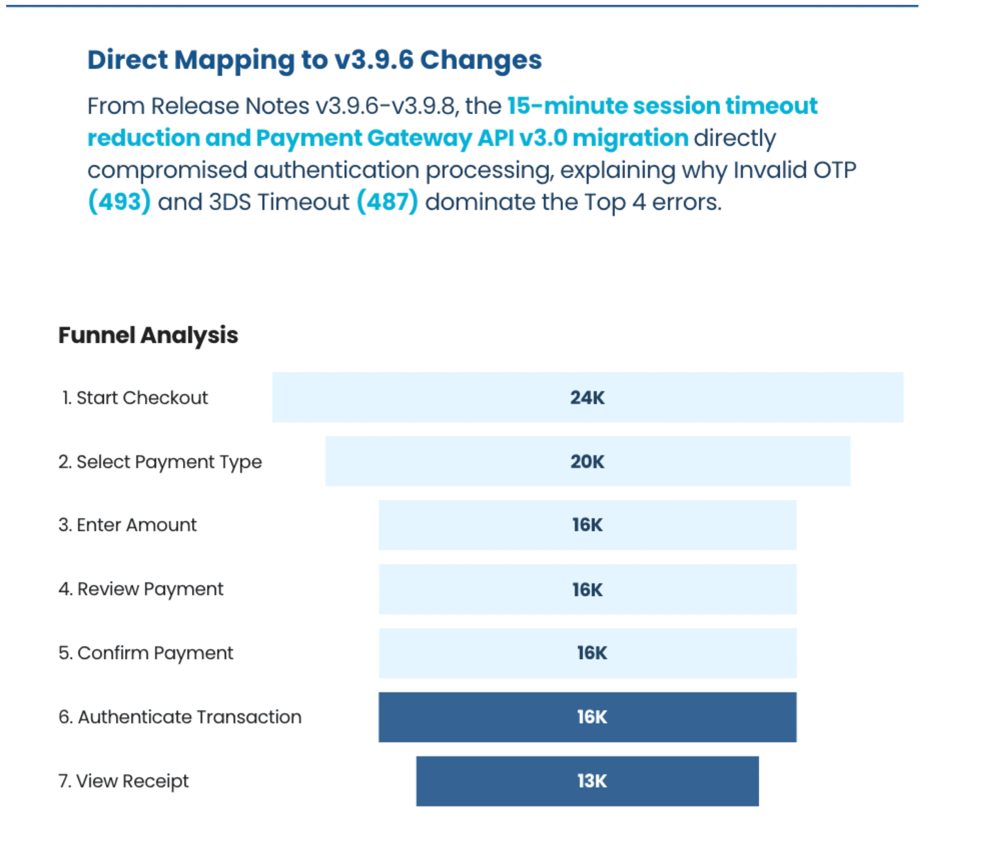 Release Impact Mapping: Cross-referenced v3.9.6-v3.9.8 release notes with error spike timeline. Traced session timeout reduction (30min→15min) to OTP_Expired surge, API v3.0 migration to 3DS_Timeout spike, flow redesign to Invalid_OTP increase. V3.9.9 emergency patch validated root cause hypothesis.