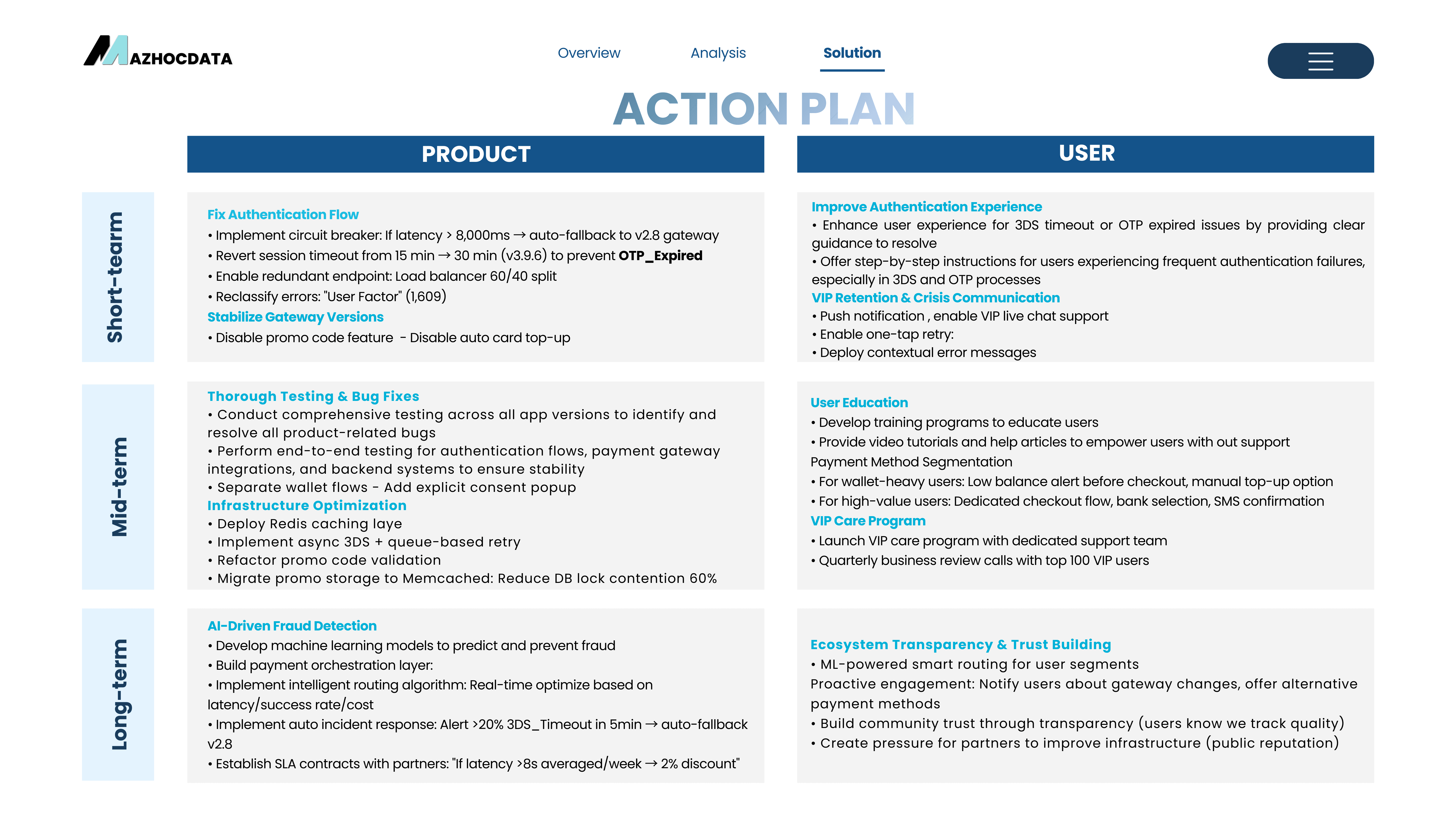 Actionable Recommendations: Structured three-tier action plan—Short-term (circuit breaker, timeout reversion), Mid-term (VIP care, UX enhancement), Long-term (ML routing, infrastructure optimization)—prioritizing authentication stabilization and premium segment protection.
